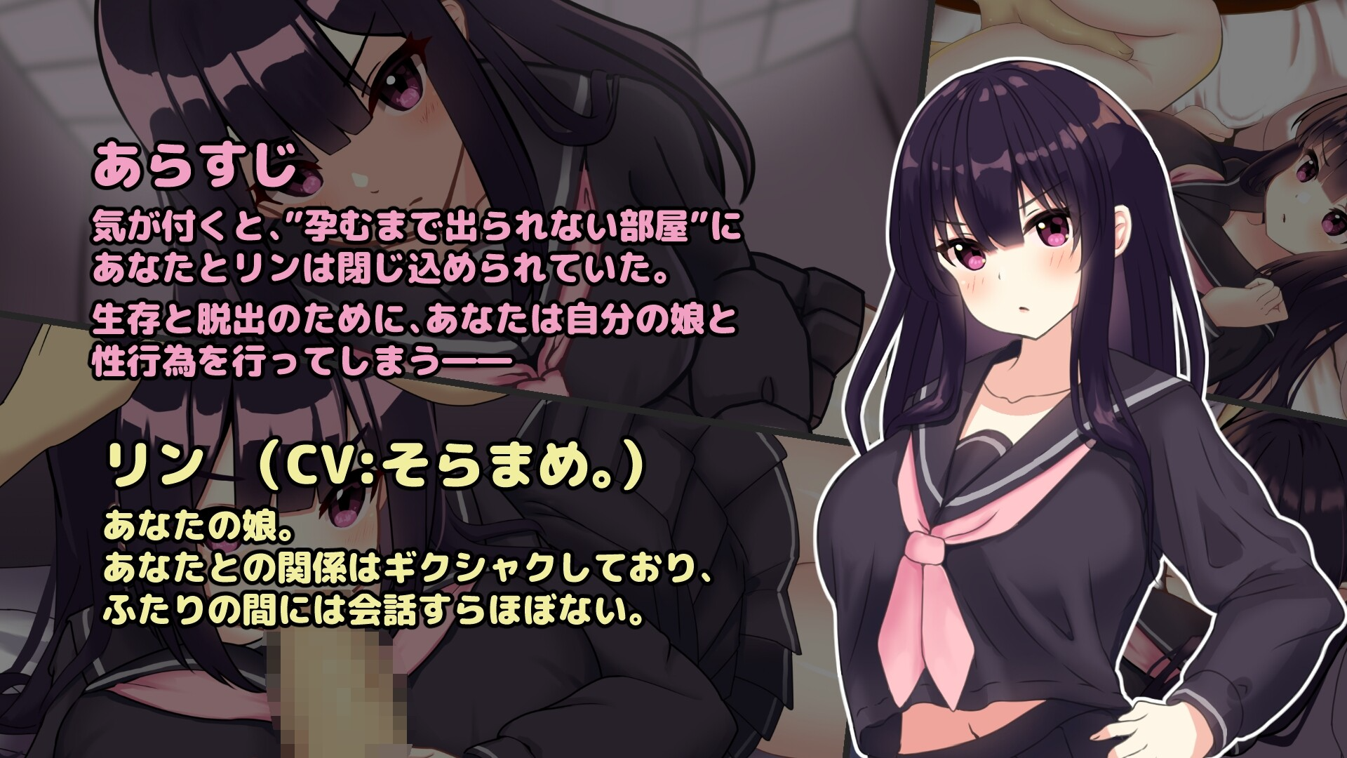 本作讲述了因政府少子化对策而被关入”怀孕才能脱出房间”的父女努力逃离的故事。 作为女主角的亲生女儿”琳”虽然对父亲态度冷淡,但为了脱出愿意配合进行亲密行为。